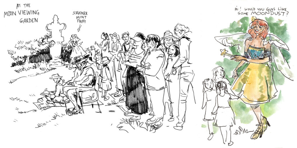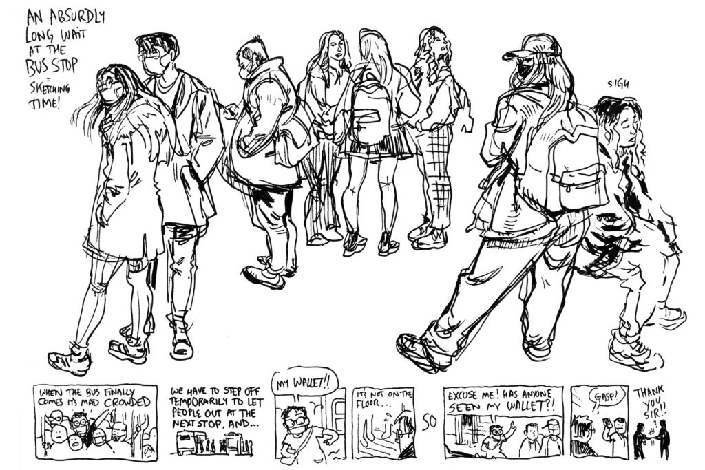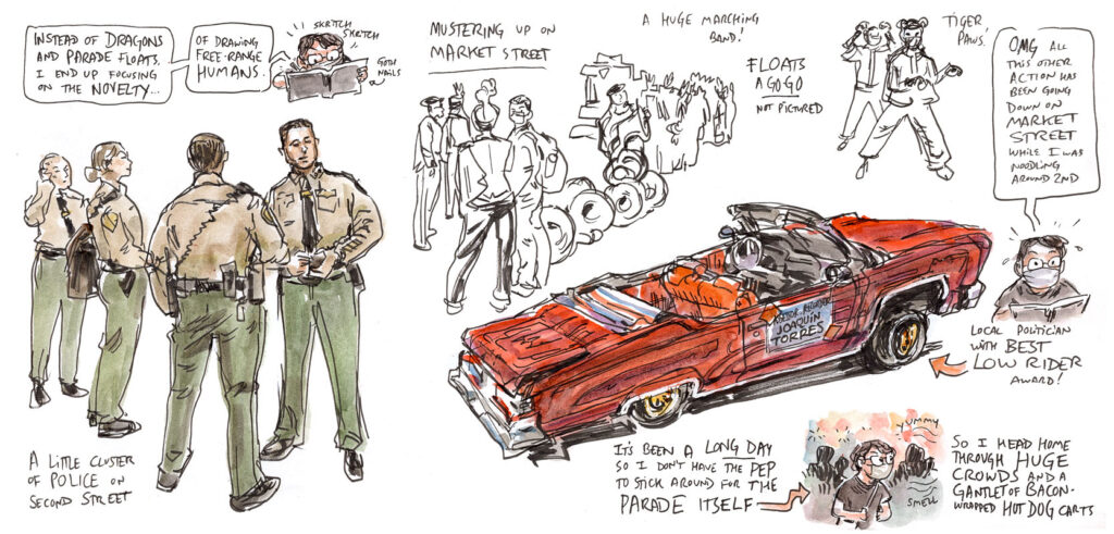 Below the fold (as they say in the newspaper racket), a selection of sketchbook pages illustrating some of these viewpoints.