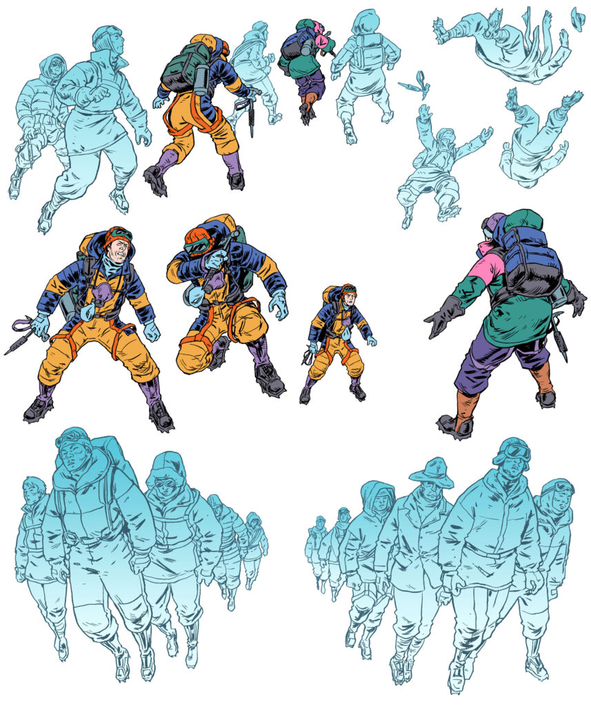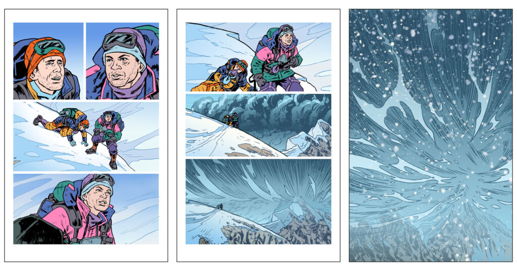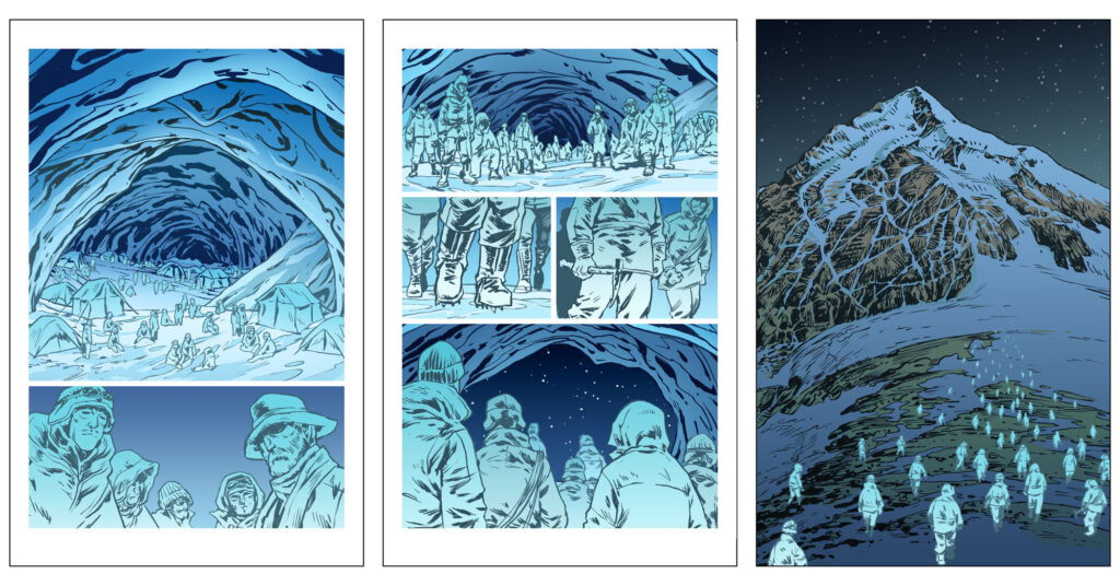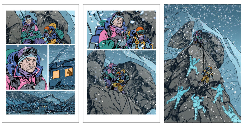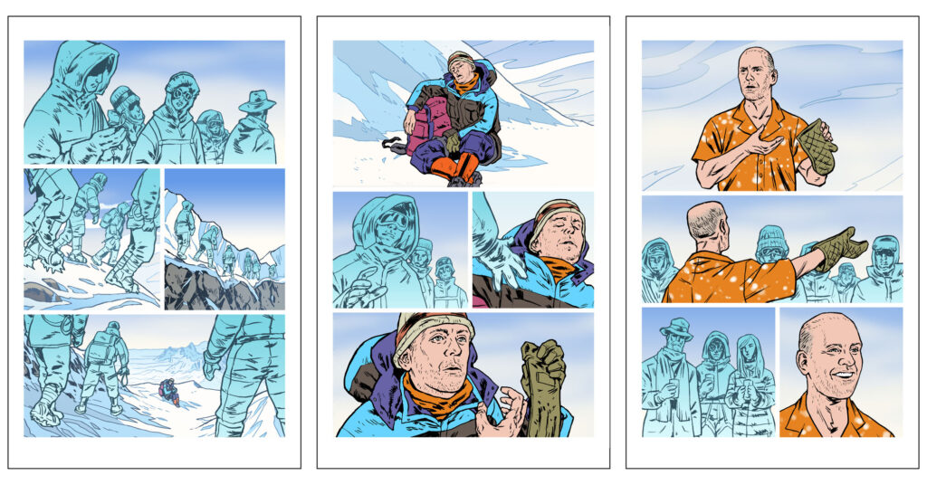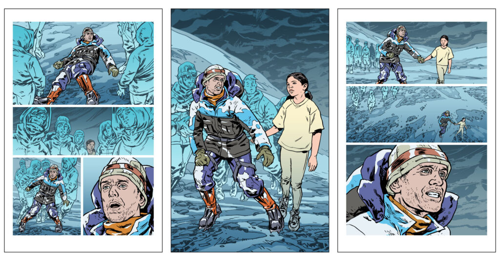 A unique project based on an opera by composer Joby Talbot and librettist Gene Scheer, directed by Brian Staufenbiel. The comic art was integrated with video capture of live actors to create an animated film. Though virtual pages appeared in the film, it doesn’t currently exist as an actual comic; below are some samples from its 80 pages. For more information, see: https://operaparallele.org/everest/